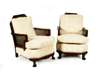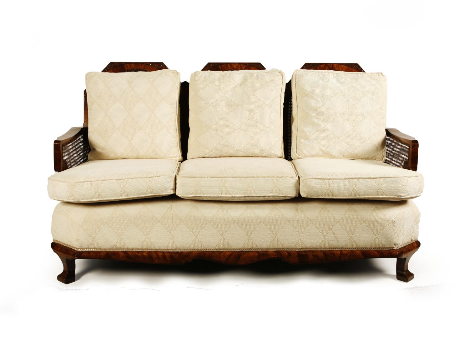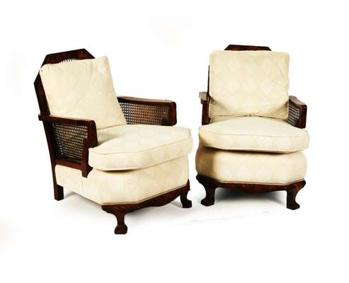the caned back and sides above loose cushions and stuff over seat, over a shaped apron, raised on squat, square cabriole legs, also two arm chairs (3)