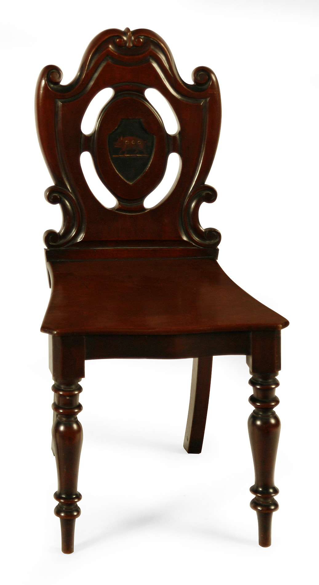 the pierced shaped back with a painted panel depicting a boar, above a plank seat, raised on turned legs (4)
