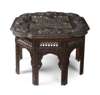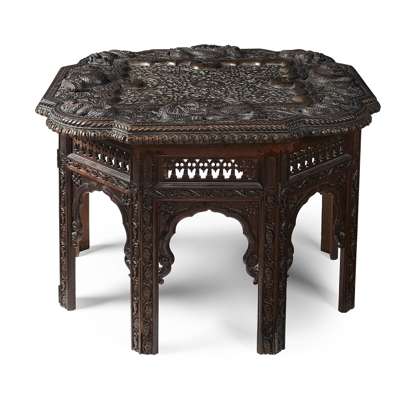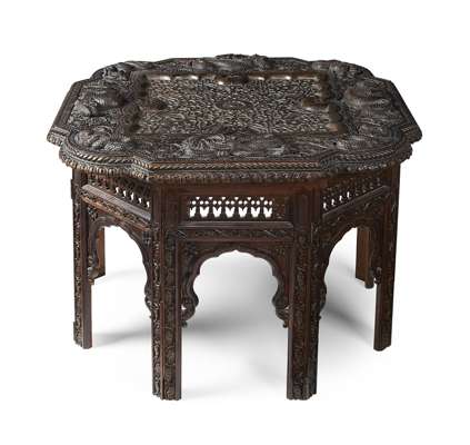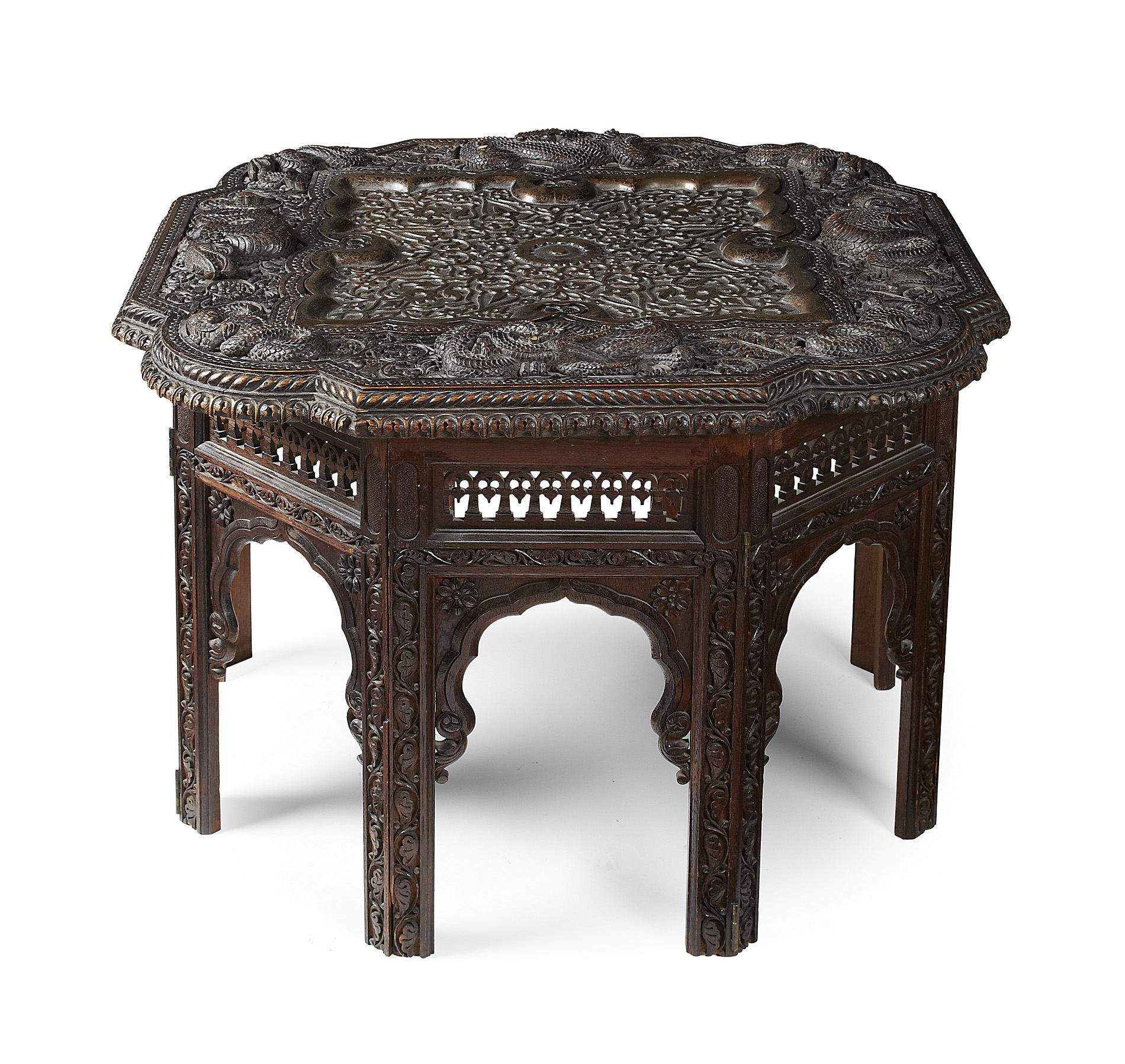 the shaped octagonal top richly carved in high relief with coiling serpents against a scrolling foliate field, centred by a foliate embossed shaped square metal tray insert, raised on a folding octagonal base with pointed arches and arcades and carved with trailing vines