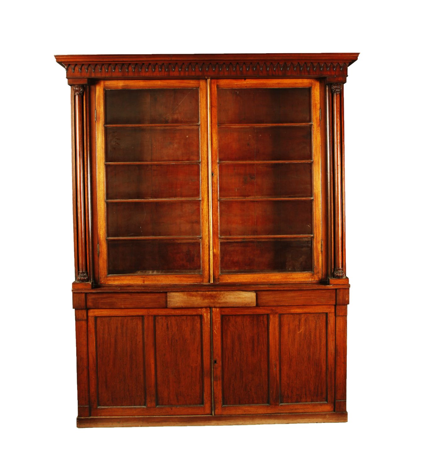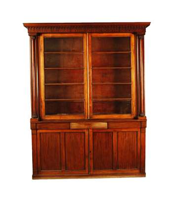 the moulded cornice above glazed doors, flanked by carved pilasters, over panel doors, raised on a plinth base