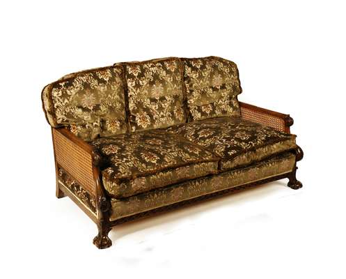 the carved back and arms above loose cushions, raised on ball and claw feet, comprising of a sofa and two armchairs (3)