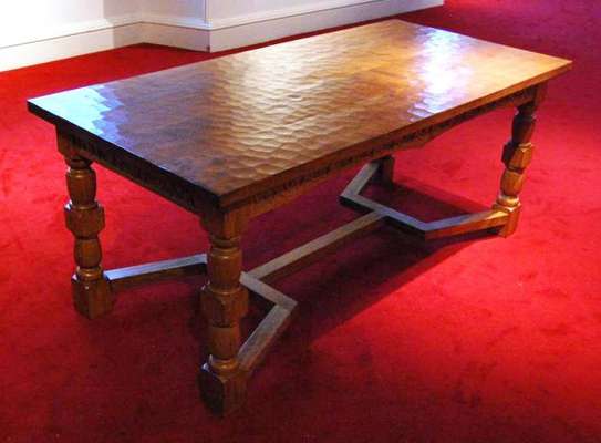 the rectangular adzed top above a frieze carved in relief with scrolling foliage raised on turned and blocked legs linked by an angular stretcher