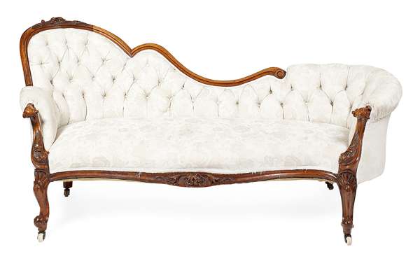 with white upholstery, the frame carved with flowers and fruit, on cabriolet legs with pot casters