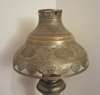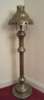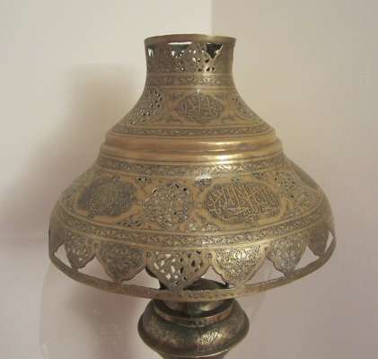 the knopped column supporting an ogee brass shade, above the domed foot, with all over pierced decoration depicting various signs and symbols