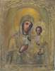 depicting the 'Iverskaya Mother of God' with a gilt metal oklad depicting a Cyrillic inscription, with paper label to the reverse 'Given to E. A. Elledge by the Priest of the Cathedral at Kuibishev.', frame marked