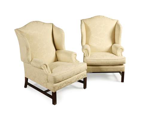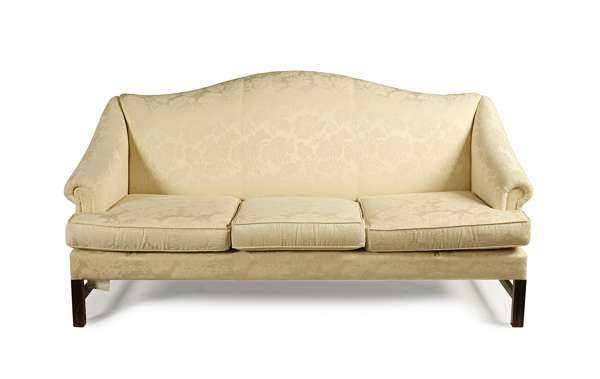comprising a three seat sofa and two wing back arm chairs, the serpentine back above a loose cushioned seat, raised on moulded legs (5)