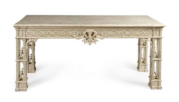 the inverted break front stone top above a blind fret decorated frieze, raised on four open work stylised gothic square supports
