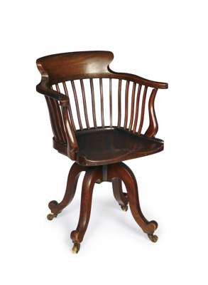 the curved back and shaped solid seat raised on four cabriole legs ending in casters
