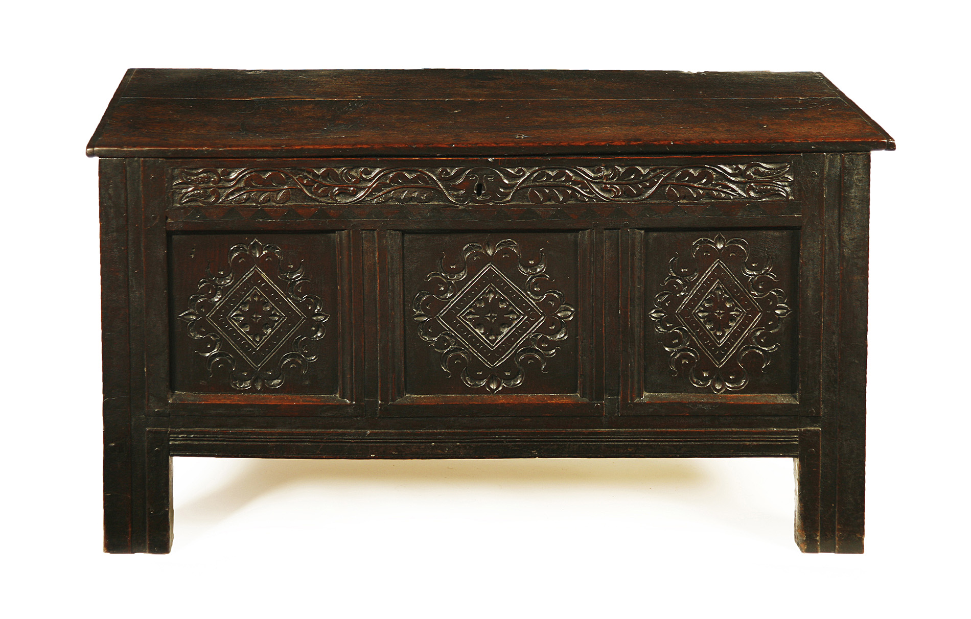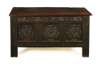 the rectangular top above a carved frieze and three carved panels, raised on block feet