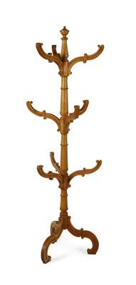 three groups of three scrolling coat hooks, raised on a turned support and a tripod base