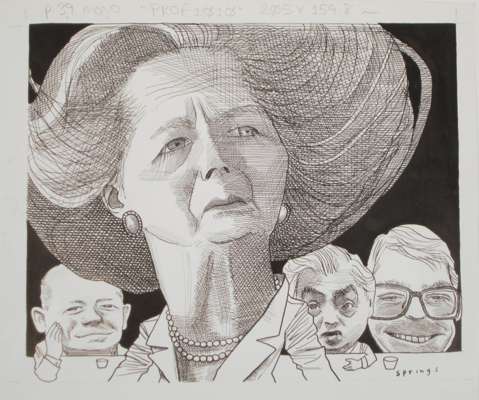 pen and ink, signed, published to illustrate a profile in the 'Sunday Telegraph', circa 2005, shown with members of her former government