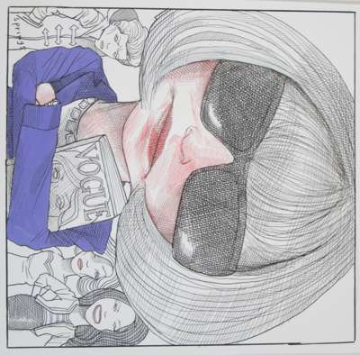 pen and ink with red ink cross hatching, signed, published to illustrate a profile of her in the 'Sunday Telegraph,' 2000s