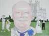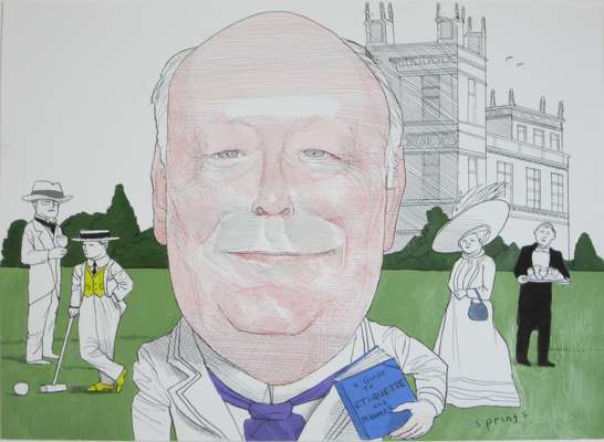 pen and ink with red cross hatching and acrylic colour, signed, published in the 'Sunday Telegraph' to illustrate a profile, 2012, shown in front of 'Downton Abbey' (Highclere)