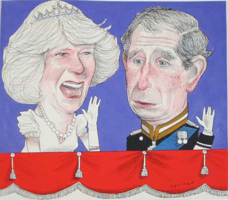 Note: Although the couple are shown on a balcony resembling that at Buckingham Palace and Prince Charles is shown in uniform, the royal couple were married in Windsor registry office and the Prince wore morning dress