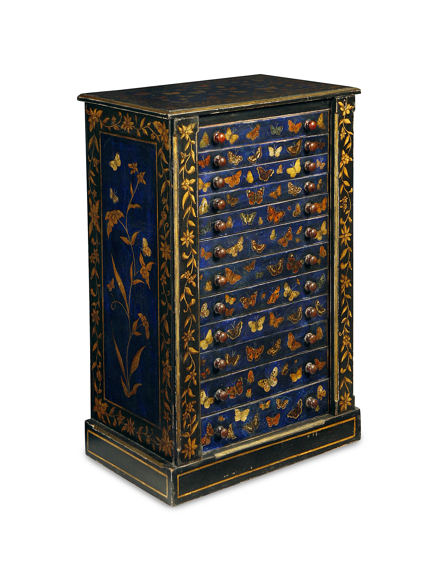 decorated throughout with butterflies and chinoiserie motifs, enriched with gilt, fitted with twelve graduated drawers and raised on a plinth base