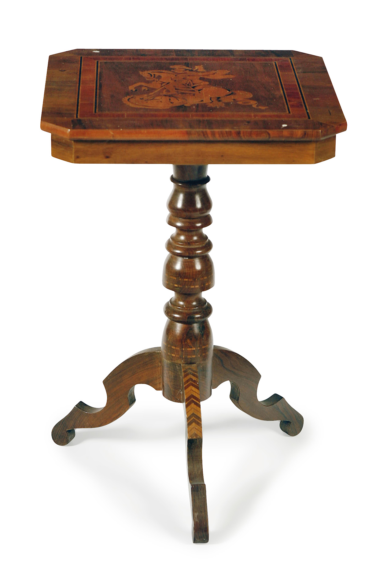 the crossbanded canted square top, centered by an equestrian medallion, raised on a turned column support ending in a tripod base