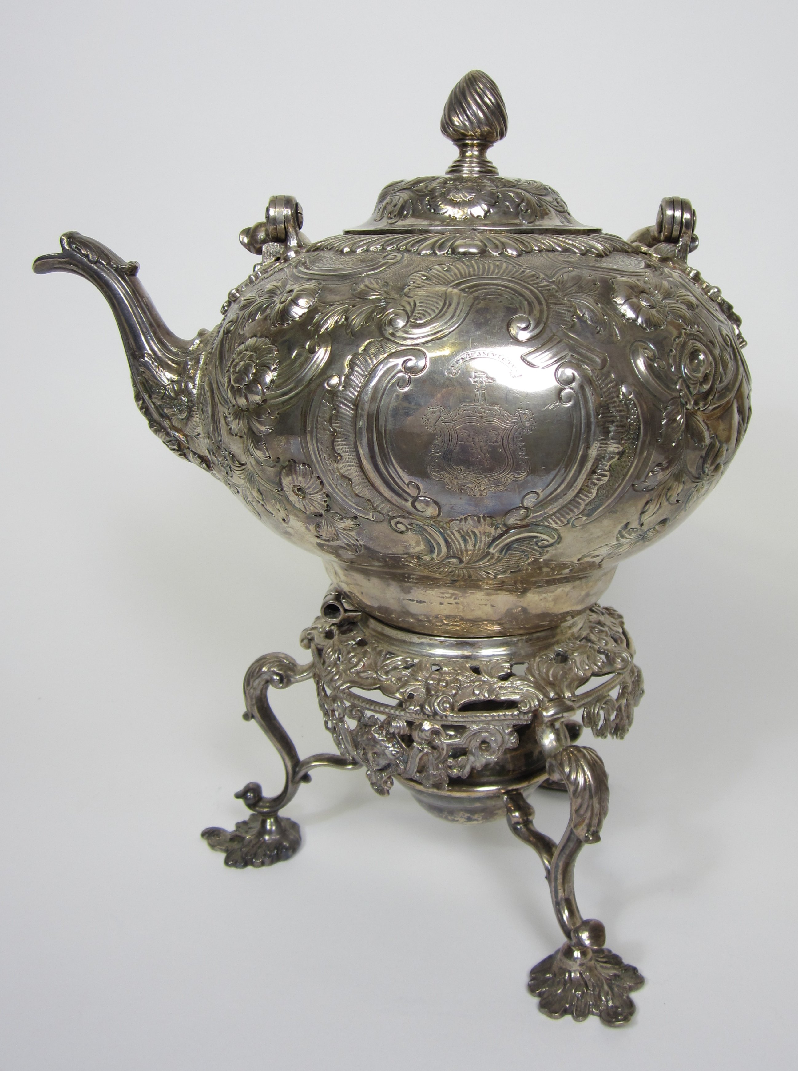the kettle of inverted pear shape with foliate scroll and shell decoration surrounding an engraved armorial, London, 1745; the stand with three outscrolling legs supporting the cast and pierced borders, circa 1775 (2)