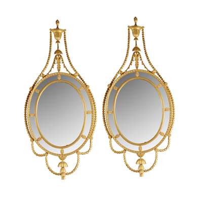 each oval shaped mirror plate within a further margin plate decorated with foliate paterae and a beaded slip, surmounted by an urn finial (2)