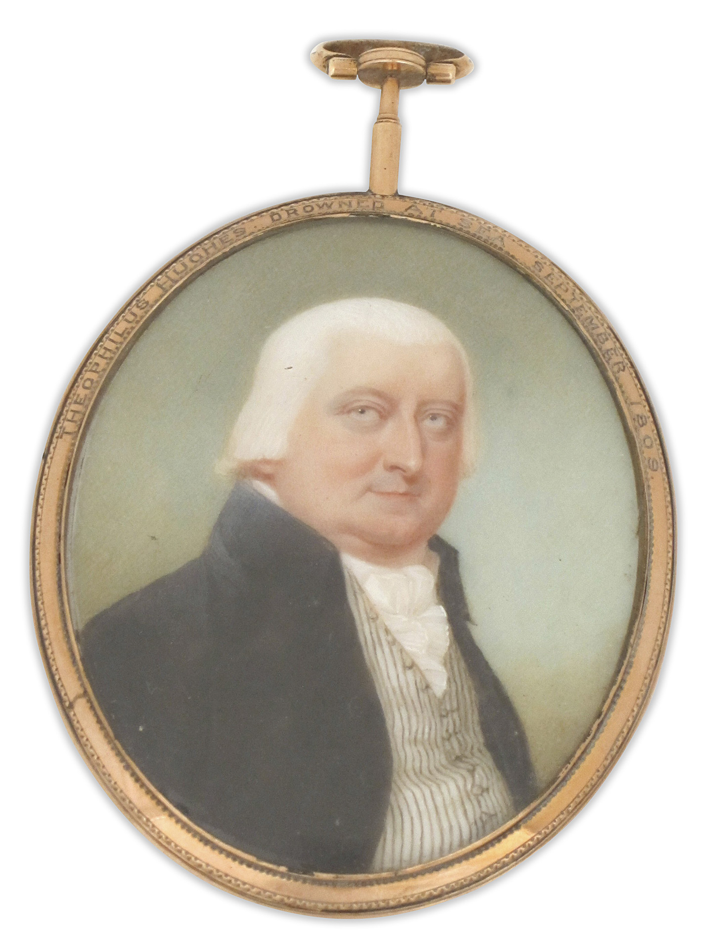 of oval form, the frame inscribed 'Theophilus Hughes, Drowned at Sea, September 1809', backed with woven hair and a gilt monogram