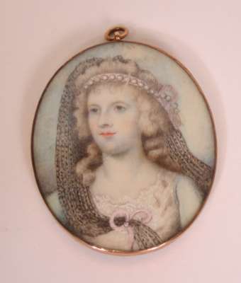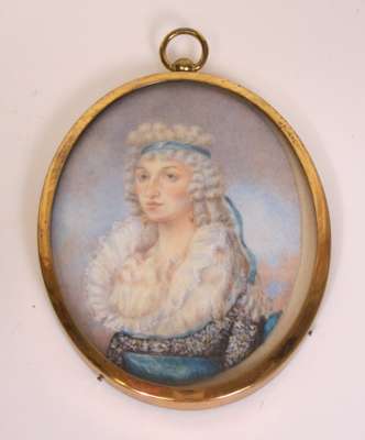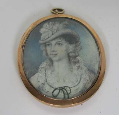 each of oval shape, on ivory, depicting various female sitters, two backed with woven hair, in glazed frames (3)