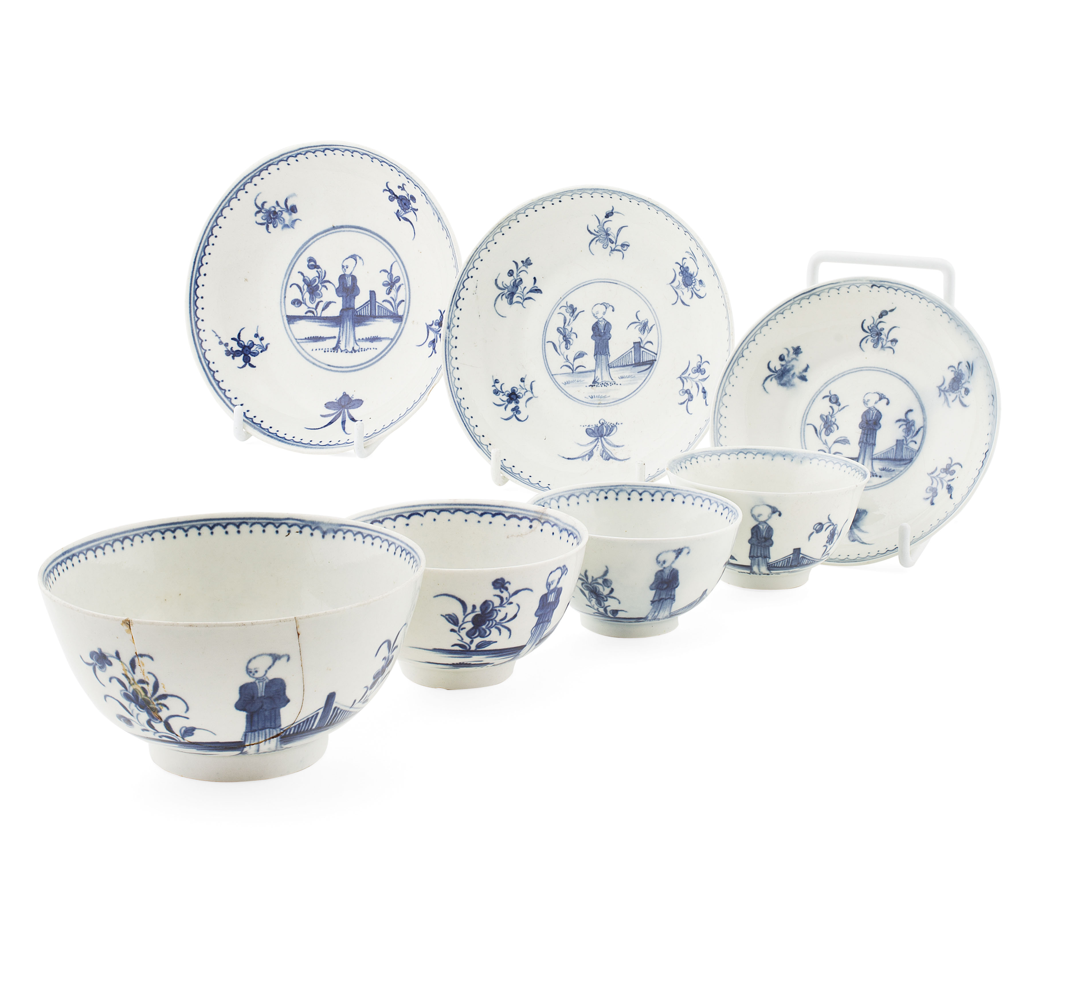 painted in underglaze blue with the 'Waiting Chinaman' pattern, comprising of three tea bowls, three saucers, and a slop bowl (7)