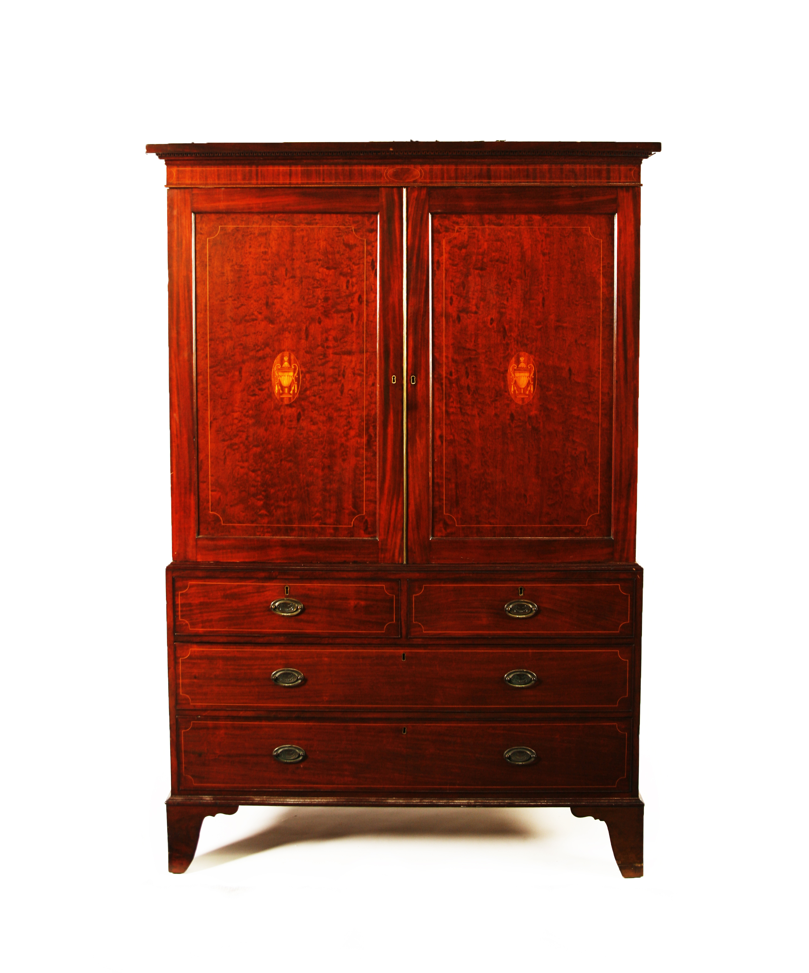 the moulded cornice above inlaid panel doors enclosing slides, over two short and two graduated long drawers, raised on bracket feet