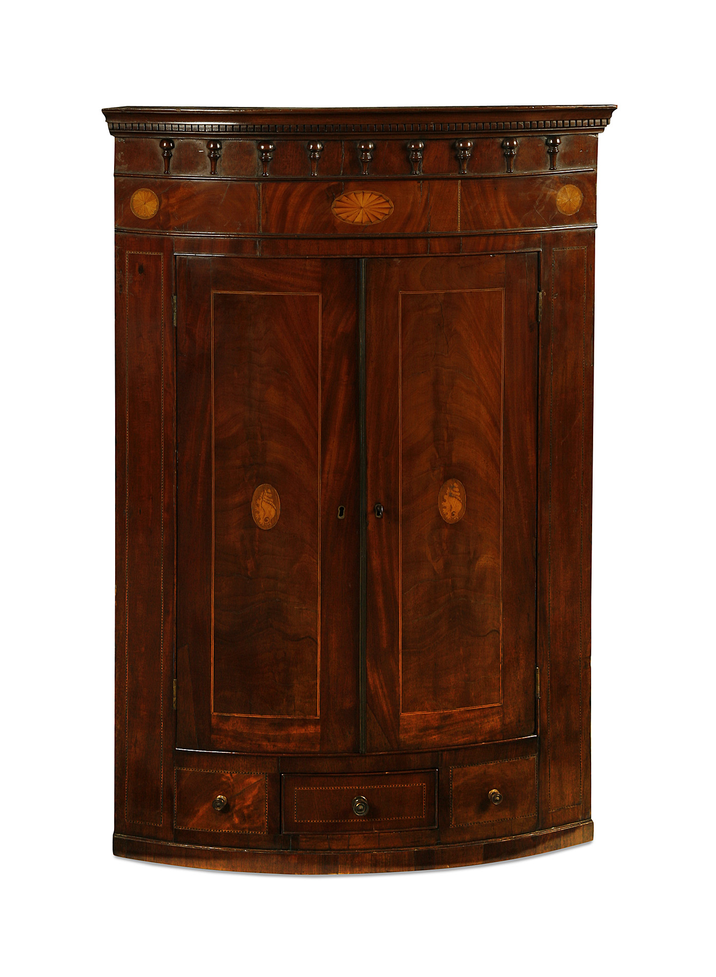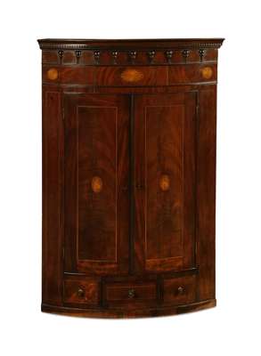 GEORGE III INLAID MAHOGANY TWO DOOR BOW FRONT HANGING CORNER CABINET