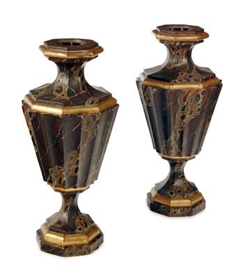 PAIR OF CONTINENTAL FAUX MARBLE AND PARCEL GILT URNS