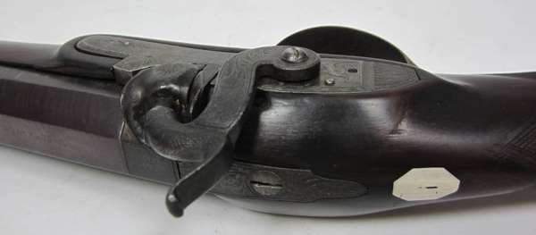the top flat of the re-browned three stage barrel signed 'Beckwith London', with a walnut half stock with a chequered grip, with silver fore end cap, silver barrel bolt escutcheons, engraved with a pineapple finial and a game dog to the trigger guard, engraved barrel tang, stepped flat lock plate with engraved game bird, replacement brass tipped ram rod