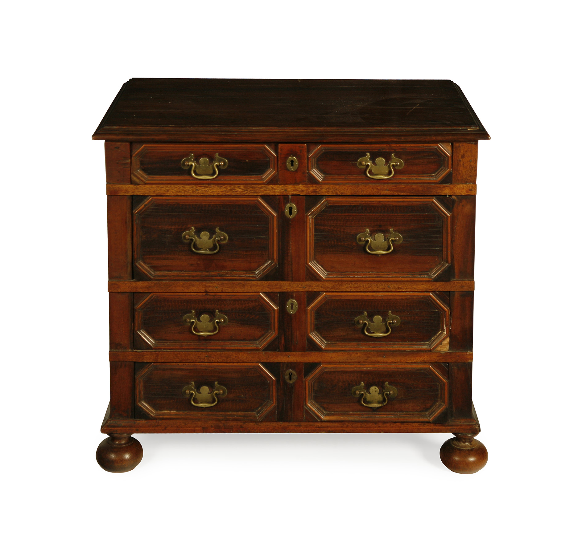 the moulded rectangular top above four graduated drawers, raised on bun feet