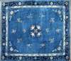 the royal blue field with circular open foliate medallion, similar spandrels, within indigo roundel and vine border with inner light blue band