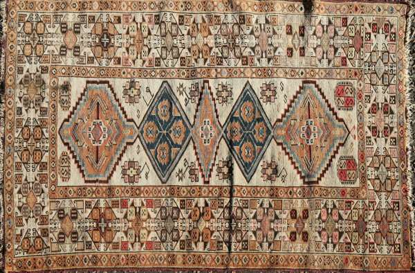 the cream field with five polychrome lozenge medallions, within cream geometric border between bands