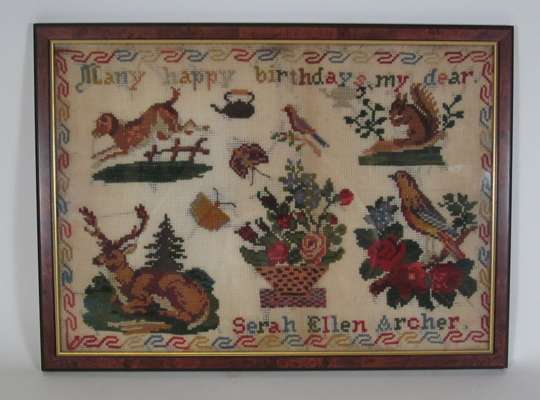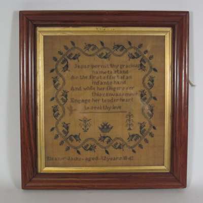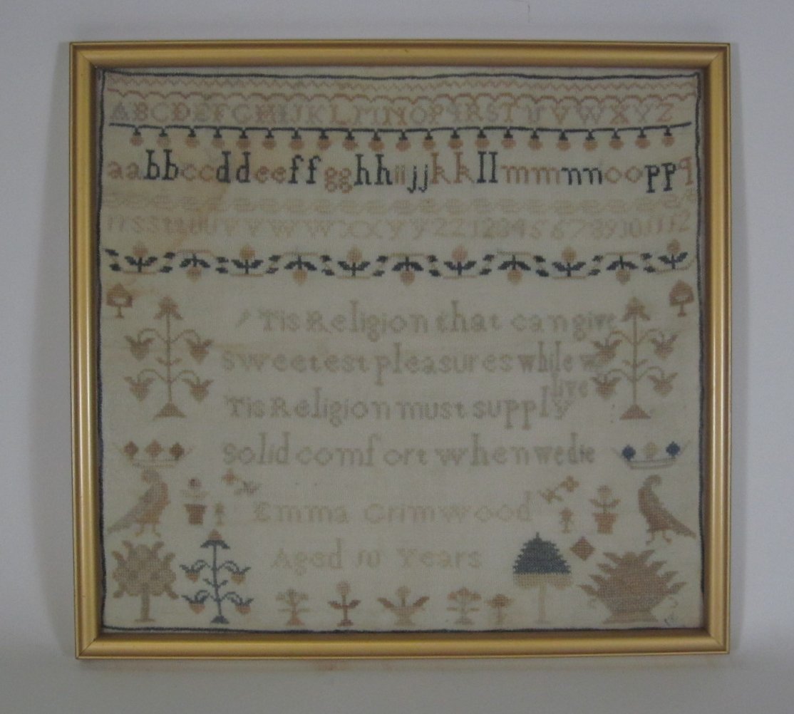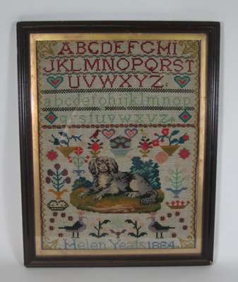 variously decorated with religious and alphabet inscriptions, and animal motifs, comprising of: two woolwork examples, by Helen Yeats, 1884, 41 x 31cm; and Sarah Ellen Archer, 31 x 44cm; and three needlwork samplers, by Eleanor Jacks, 1843, 29.5 x 27cm; Emma Orwood, 28 x 30.5cm; and Sarah Aykroyd, 1834, 50 x 46cm (5)
