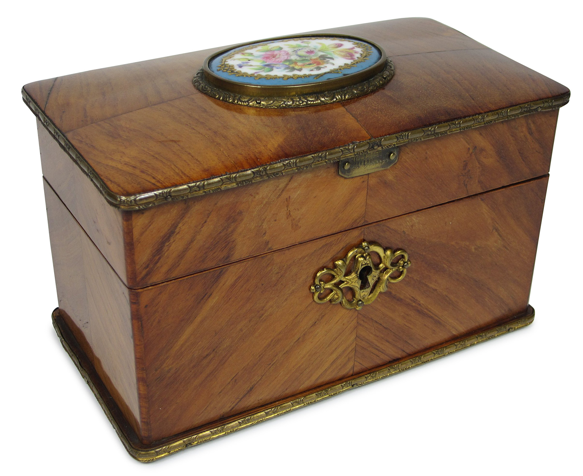 of rectangular form with gilt metal mounts and a plaque inscribed 'Yohann', the hinged lid inset with a Serves style porcelain panel depicting flowers, opening to reveal a void interior lined with lilac material