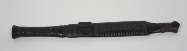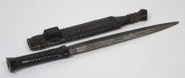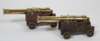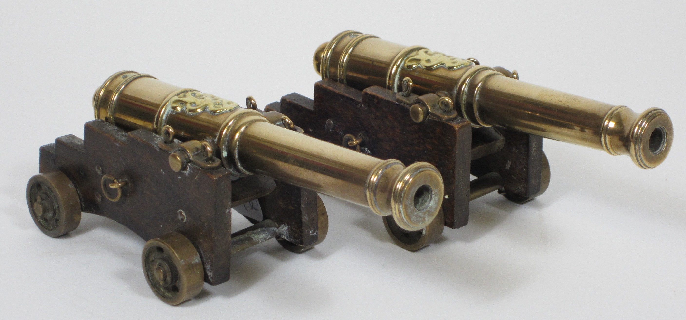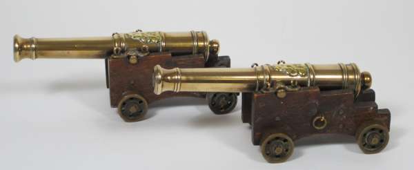 each of typical form with cast decoration, pivoting on a beech carriage with four wheels, 17cm long; together with an AFRICAN KNIFE, with a carved wooden scabbard and hilt, blade, 20.5cm long (3)