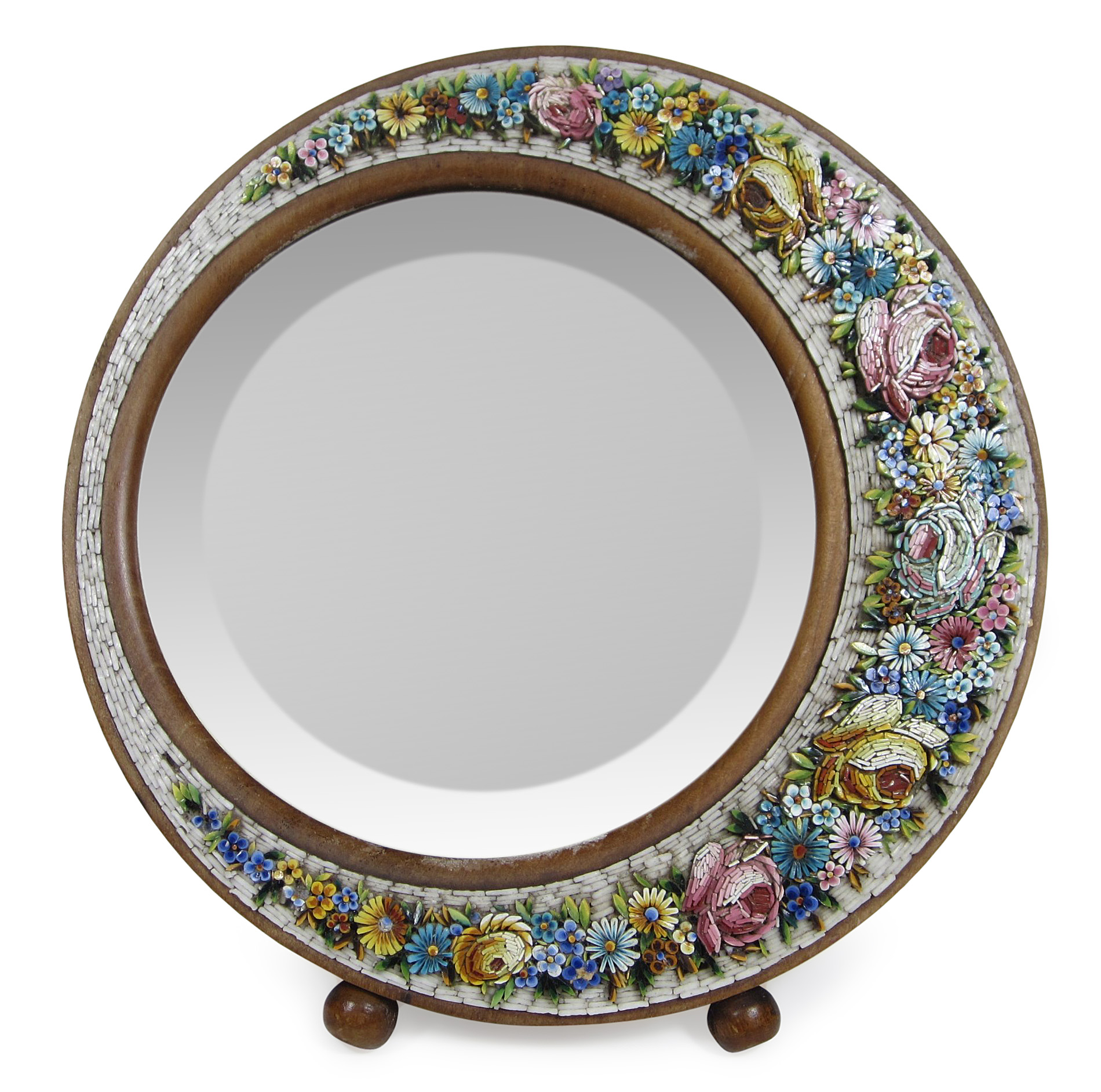 all with decorative foliate detail, comprising of: an arch shaped example, 21.5cm high; a circular strut mirror, 18cm high; a small pair of frames; and three other pieces, one labelled 'Real Florentine Mosaic' (7)