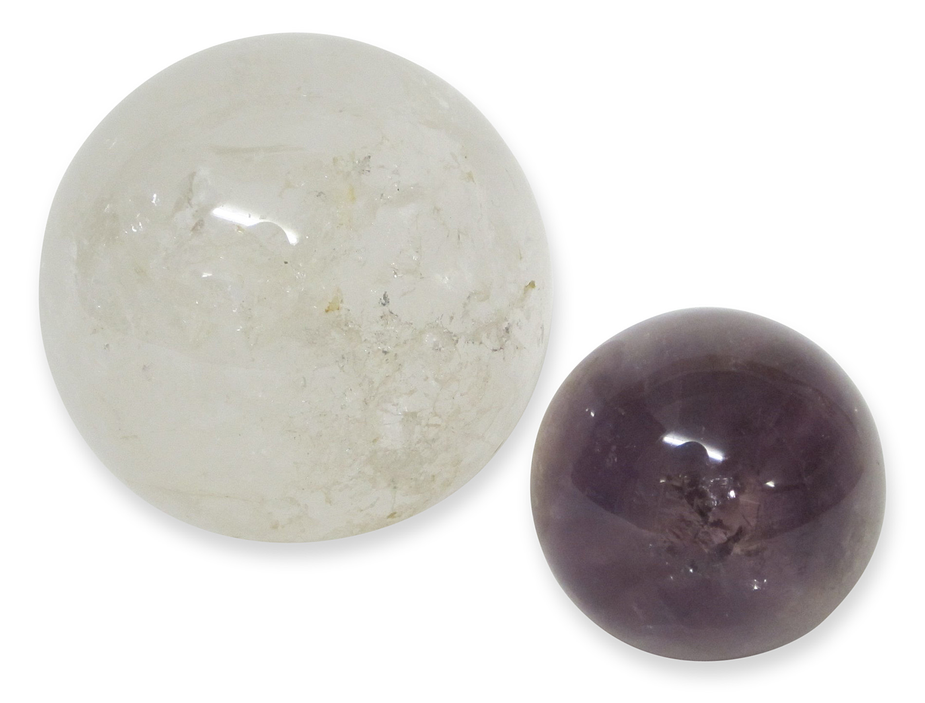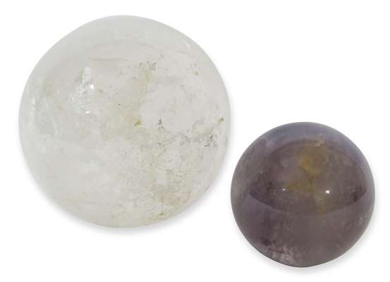 of spherical form with natural inclusions, 47cm circumference; together with an AMETHYST BALL, of similar form and style, 30cm circumference (2)