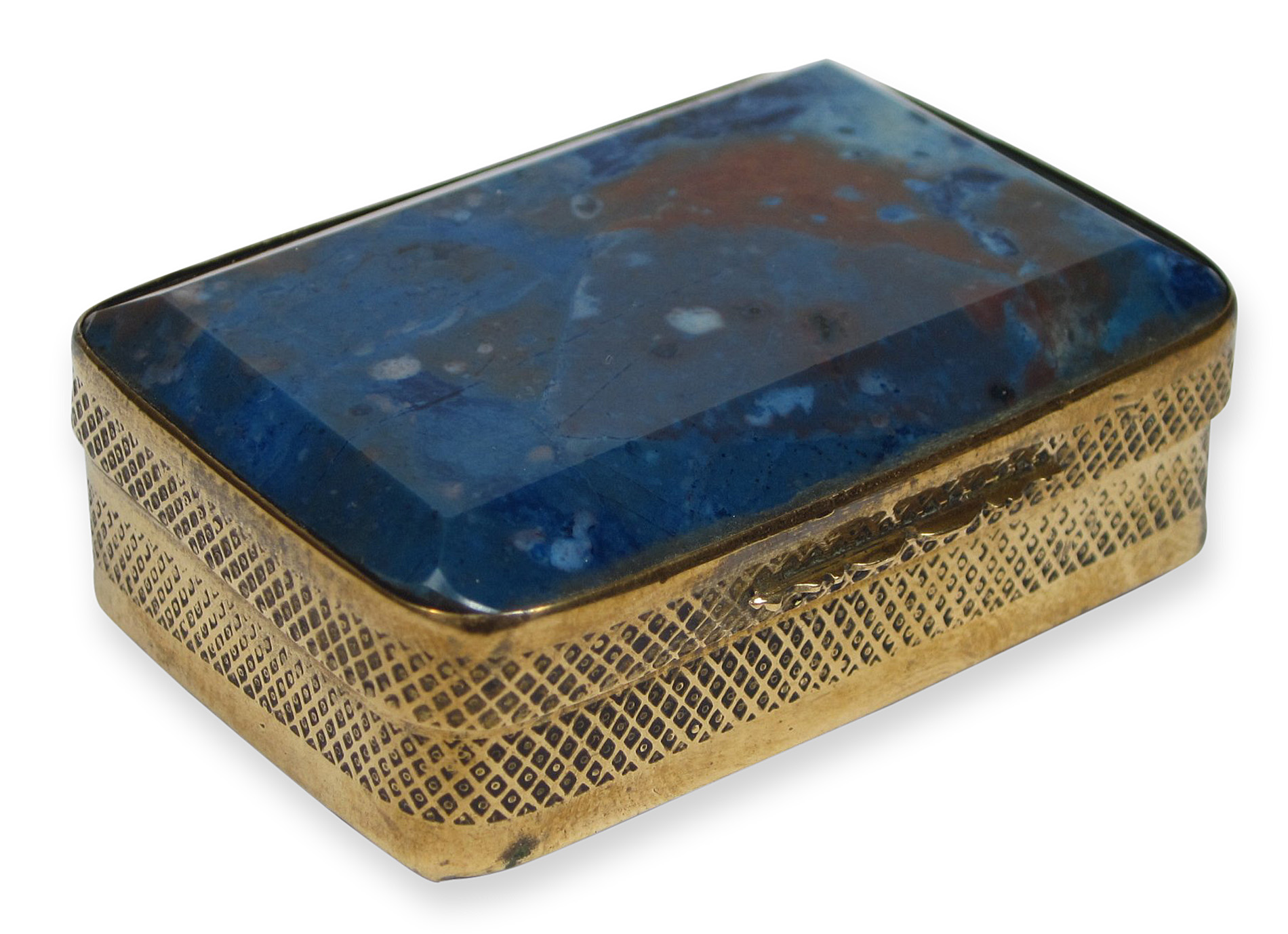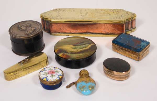comprising of: an 18th century copper and brass Dutch tobacco box; a papier mache box and cover; a jade ground enamel box and cover; two agate and gilt patch boxes; a coin decorated box and cover depicting Charles James Fox, 1806; a small enamel pill box; a heart shaped glass perfume bottle; and an unusual brass vesta case, modelled as a violin case, largest 16cm wide; together with a CARVED CAMEO SHELL, depicting a classical gentleman, 13cm wide (10)