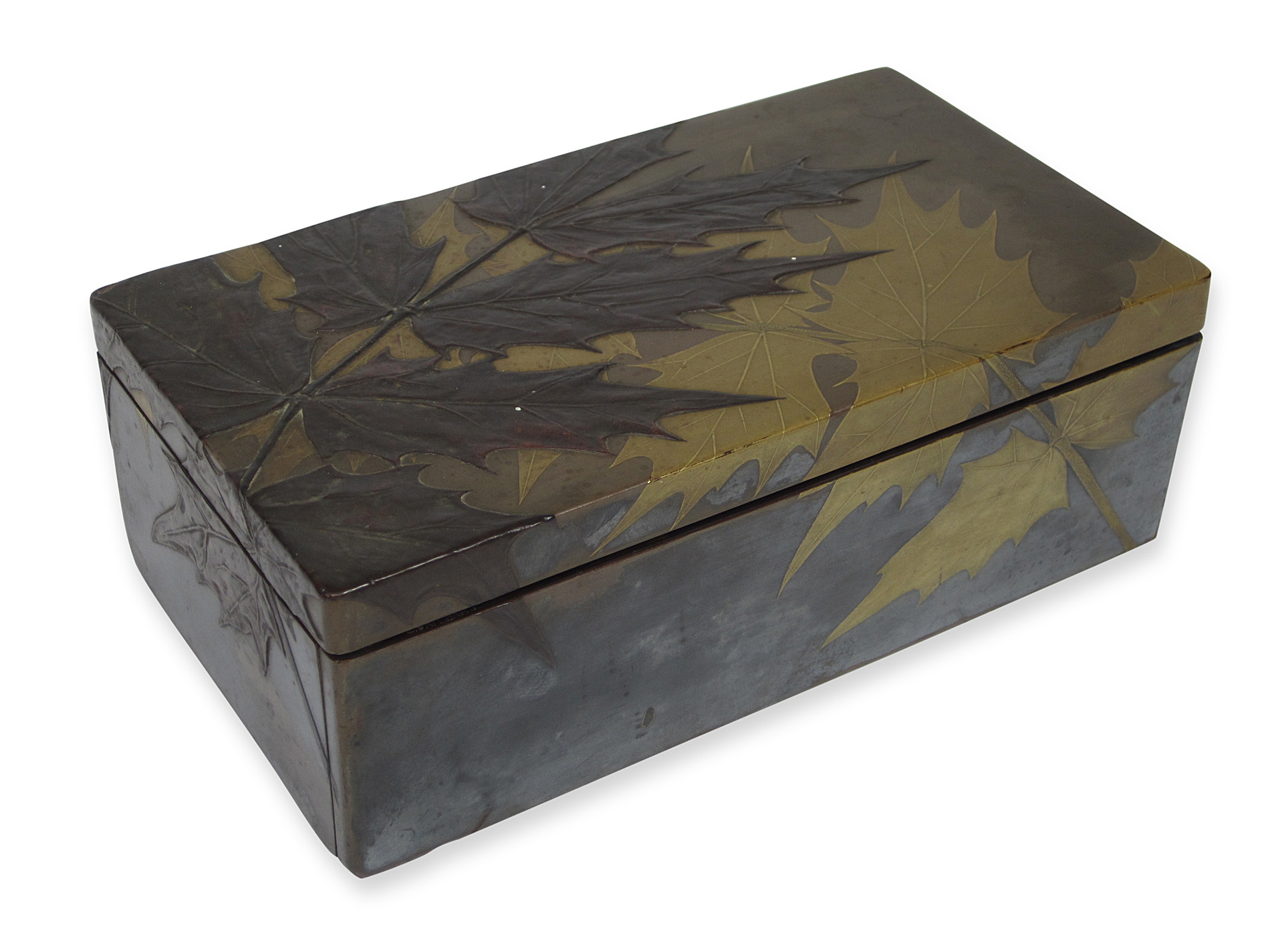 of rectangular form, decorated with brown and gilt acer leaves in low relief, the hinged lid opening to reveal three void compartments and a fold-out flap, stamped 'L.Gaillard'