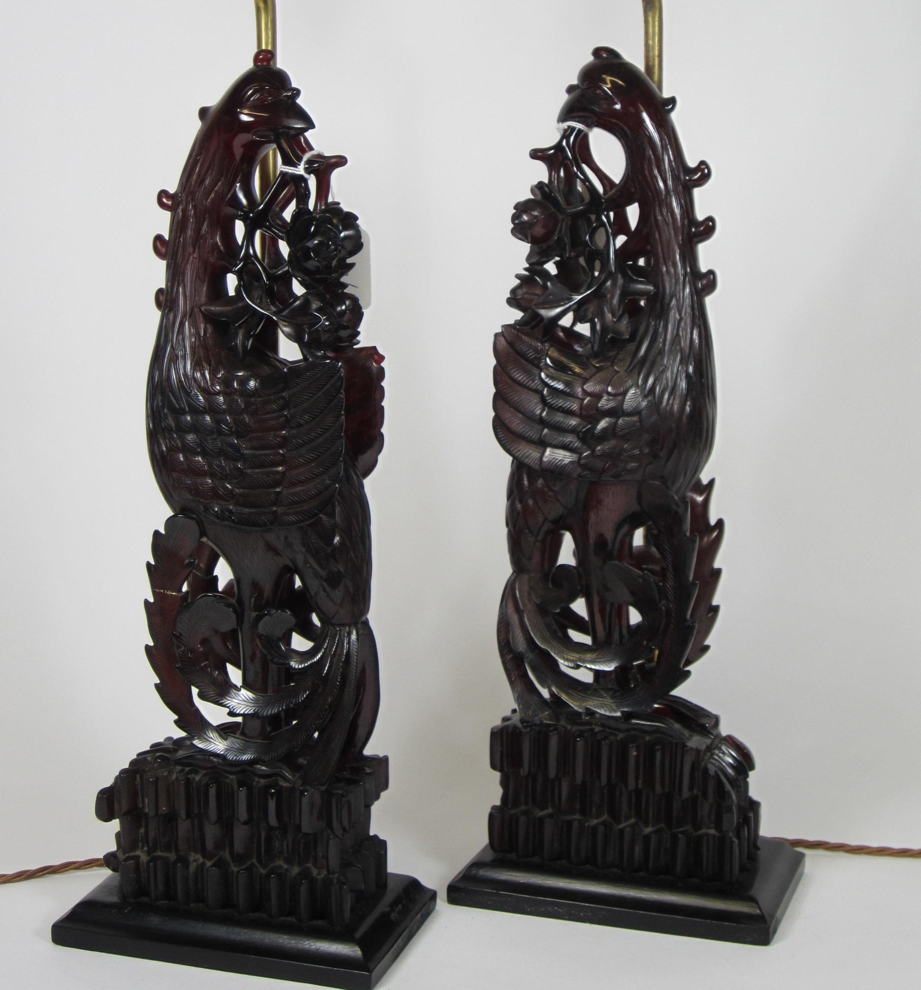 each modelled in the Chinese style, depicting an exotic bird with foliage in its beak, converted to a lamp (2)