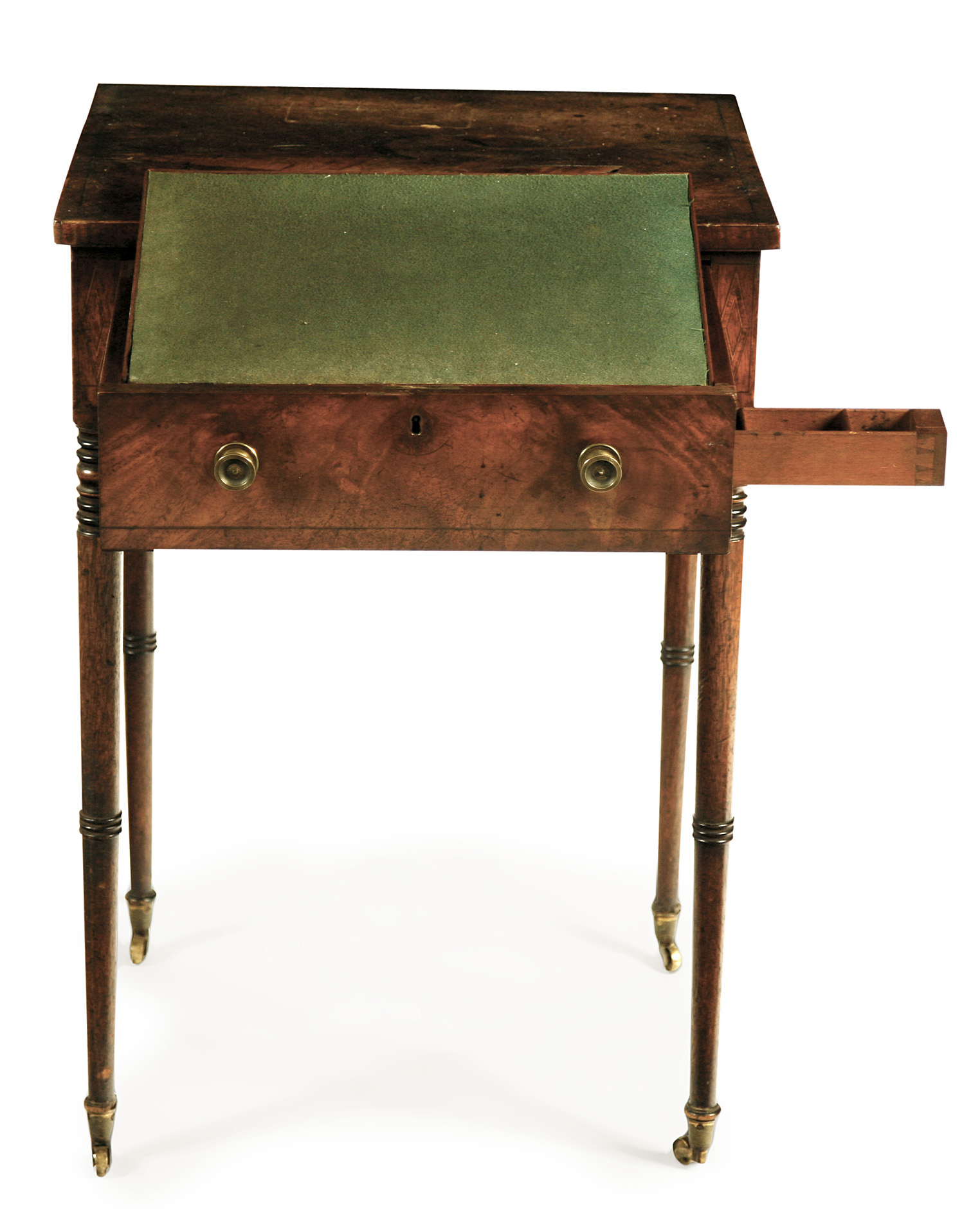 the cross banded square top above a frieze drawer enclosing a writing slope, raised on ring turned legs with brass caps and casters