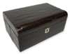 of casket form with a white metal lock, the hinged lid opening to reveal a lined interior with a lift-out shelf