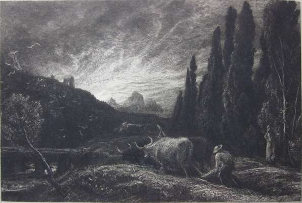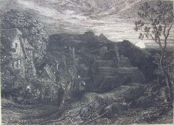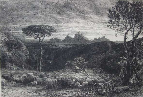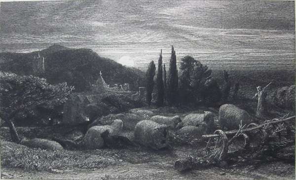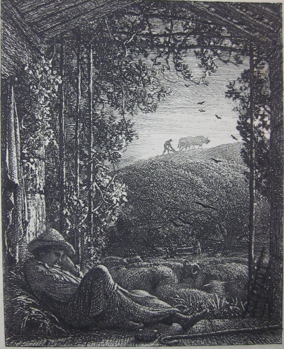 'The Lonely Tower', signed in pencil to margin and inscribed 'Trial Proof'; 'Resting Shepherd', signed in plate; 'The Skylark', signed in plate; 'The Rising Moon', signed in plate; 'Opening the Fold' or 'Early Morning', signed in pencil to margin; 'Sunset', initialled in plate; 'The Early Ploughman', unsigned; 'Morning of Life', cut to margin; ); 'The Herdsman', unsigned; 'The Bellman', margin marked by artist with instructions re. alteration of the plate