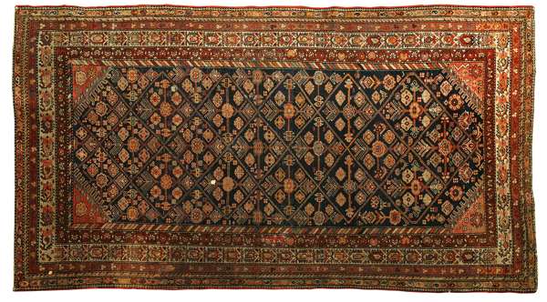 the indigo field with allover foliate lattice pattern, within ivory geometric border between bands