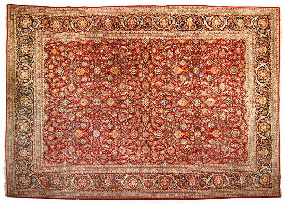 the scarlet red field with allover palmette, rosette and foliate vine pattern, within indigo palmette and arabesque vine border between bands