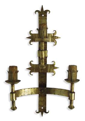 each strap-like support fixed with shaped horizontal panels flanking a single sconce above two further sconces (2)