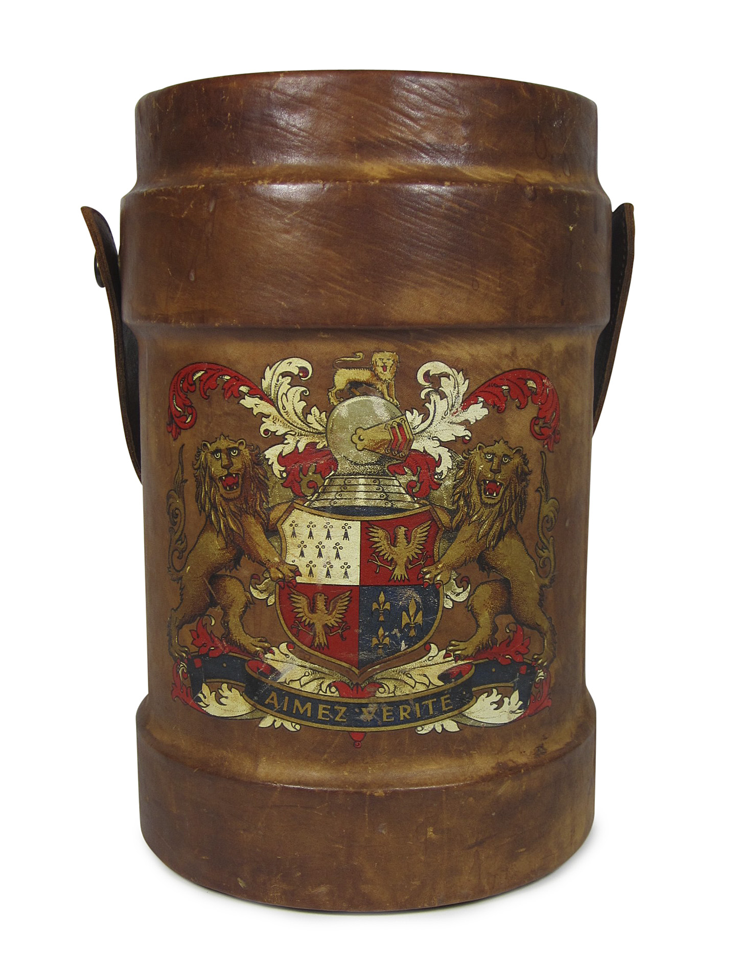of cylindrical form with a bale handle, decorated with a printed coat-of-arms and the motto 'Aimez Verite'