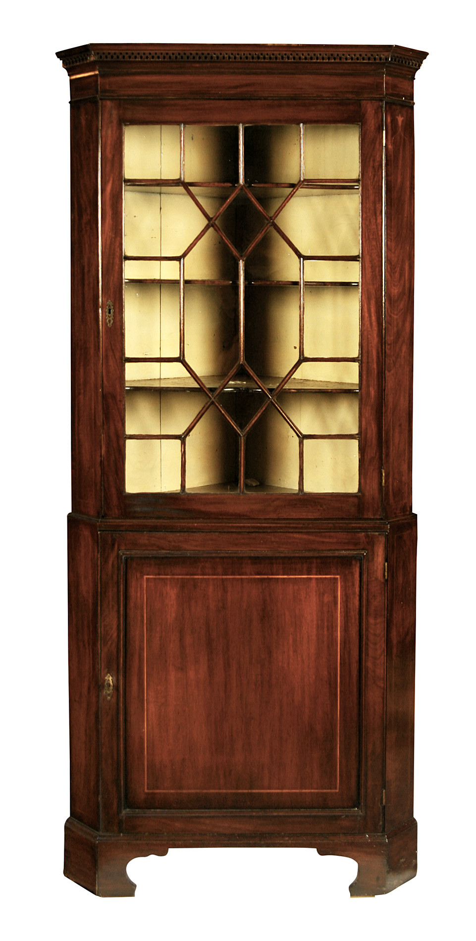 the moulded cornice above an astragal glazed door enclosing shelves, over a boxwood strung cupboard door, raised on bracket feet