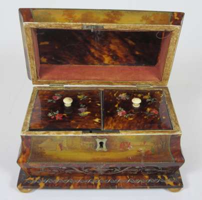 VICTORIAN TORTOISESHELL AND PAINTED TEA CADDY