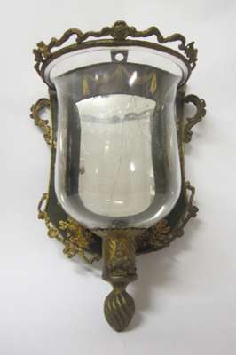 the inverted bell shaped glass shade supported by a green painted toleware back with a shaped mirror insert, with gilt metal mounts